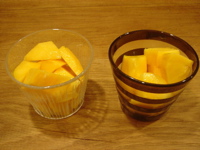 これは主人の母からのお裾分け。何でも宮崎の1つウン千円もするマンゴーだとか…。器も辻さんのガラス器に入れて。