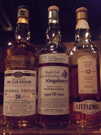 今日は、すでに閉鎖されたウイスキー蒸留所のボトルを3本、並べてみました。ウイスキーは、蒸留した原酒を何年も樽熟成させてから瓶詰めする、という製造工程のため、何かの事情で蒸留所が稼動を停止した後も、原酒のストックがある限り、新商品がリリースされ続けます。一番右は、リトルミル12年スコットランド、ローランド地方のシングルモルトです。ローランド地方は、マイルドで口当たりの柔らかいウイスキーが多い産地ですが、このリトルミルは、ローランドのモルトとしては、やや辛口の部類に入ると思います。蒸留所は1994年に閉鎖されたようです。リトルミル12年 正規 40度 700ml 【箱入り】真ん中は、先日のブログでとりあげたキングスバリー社 ローズバンク16年 ヴァルデスピノ カスクリトルミルと同じローランド地方のシングルモルトです。リトルミルが、ローランドでは珍しい2回蒸留なのに対して、こちらは伝統的な3回蒸留のウイスキーです。甘口シェリーの風味がよく感じられて、大変魅力的ですね。こちらは1993年に閉鎖。【円高還元セール】【ブリティッシュフェア】キングスバリーKSCローズバンク16年 ペドロヒメネスカスク一番左は、ダグラスレイン社 ポートエレン24年 ファイナルヴィンテージポートエレンは、スコットランド、アイラ島にあった蒸留所です。「ファイナルヴィンテージ」の名の通り、最後の蒸留年となった1983年の原酒をボトリングしたものです。このポートエレンは、長期熟成の複雑で華やか香りと、アイラ独特のピート香が入り混じって、他のウイスキーでは全く味わえないような素晴らしい味わいを持っています。閉鎖から20年以上、経っている蒸留所なので、今後リリースされる商品は、更に高騰していく事が予想されます。味わうなら、今のうちがチャンスかもしれません・・・。ポートエレン蒸留所閉鎖直前のラストヴィンテージ★ダグラスレイン・ポートエレン24年 [1983] ザ・ファイナル・ヴィンテージ 正規 57.7度 700ml 【限定品】【箱入り】BarW 次回のライブ!3/1(日)スミ☆アヤコ(ボーカル)藤谷典史(ギター)三浦剛司(ウッドベース)オープン 19:00スタート 20:00(2ステージ)チャージ \2000ご予約はBarW03 3375 6061までぐるなび