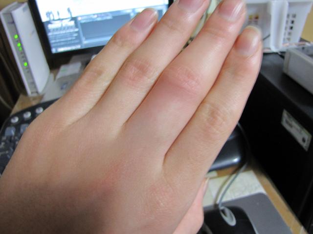 今日の話題は指です今日の放課後の話。T.S.君がいろいろとちょっかいを出してきて、思いきり手を蹴られました。で、はれました・・・中指が微妙に他より太くなったのがわかるかな?で、その後も足をやられて出血したりと、いろいろと悪い事があった一日でした。P.S.ついでに、今日学校をやすんだN君がネットゲームをやってたんでちょっとむかつきました。以上。