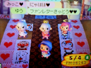 はぁ~今日は、やっとこさ、ナマズが釣れましたこれで、ナマズの悪夢からも開放されるぞぉ~~今日の通信~~夜中に開あけて~さっそく、マリィが来てくれまちたっ家のなかで、マリィの不眠について語る…語っていたとこに、うさぎ登場~んで、始まったのが、『帽子試着会』並べまくって、みんなでかぶりまくった!こんなことしてみたり~。しかし、マリオの帽子にヴィトンの服は合わんかったねちなみに、時間ずれてますが、この時点で朝の5時だしおひらきしたの、朝6時過ぎww