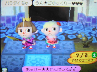 今日ゎ夜の開門をして、レインc、ゆうくん、プラcと楽しく遊びました話すほうに夢中になってて、写真撮るタイミングが、おかしくなっちゃってゆうくん、今度、男の子の格好も見せてね(*^_^*)レインc、また話せるの楽しみにしてる~プラc、いつも本当にぉしゃれで、毎回感激おみやげ、たくさんありがとぉ持ってないのあったので、アイテム増えて嬉しい\(^o^)/ちかぃうちに、みんなの村にも遊びに行く~また会えるの、すっごく楽しみにしてますクリックしていただけると、すごく嬉しいです♪