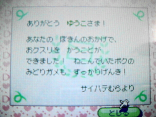 普通に買えるアイテムは、ほぼ揃って来たので、いま、せっせと募金を始めてますみどりの羽は、けっこう前にもらってあったので、今日は、20万ベル募金して、あおい羽をもらぃました早く、にじいろの羽が欲しいなぁクスリを買うことが出来たなんて、感動する~でも…どうして、みどりガメ(^_^;)ポチっと押していただくと、ほんと嬉しいです゚.+:。(pωq)゚.+:。