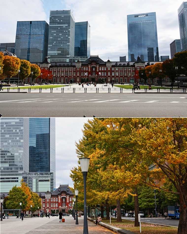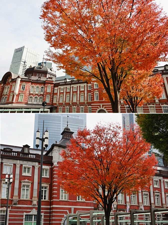 写真2 東京駅丸の内中央広場。紅葉したケヤキ並木。