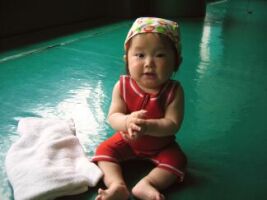 ベビースイミング。これで、約3ヶ月通いました。しゅうちゃんは、水が大好きみたいで、ちょっとくらいお顔にかかっても、水を飲んでもへっちゃらのようです。でも、実はママがもう少しでお仕事に通うのでスイミングを続けることができません。こんなに大好きなのに・・・ほんとならもっと続けてあげたいです。仕方ないよね。ごめんね。お休みの日に、家族でプールに出かけようね!写真、見てみて!一人で浮いてられるし、なんとなく犬掻きのようにバタバタして前に進めます
