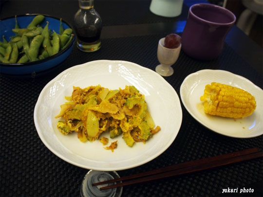 ゴーヤチャンプル、高原とうもろこしのバター醤油、枝豆、葡萄