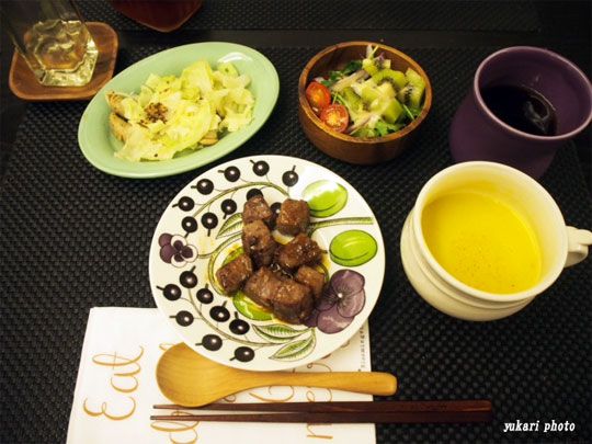 サイコロステーキ、☆キャベツとウィンナーのレンジ蒸し、サラダ((レタス、レッドオニオン、きゅうり、トマト)、かぼちゃのスープ(キヌア入り)