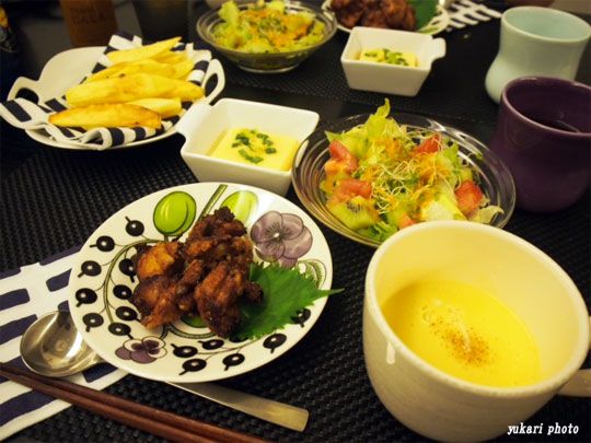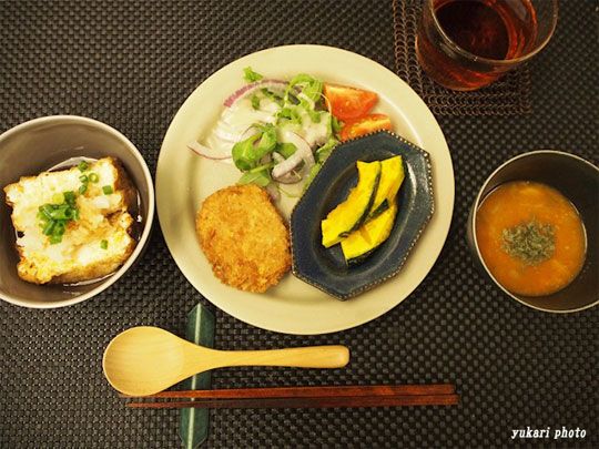 チーズメンチカツ(三田屋)、かぼちゃの素揚げ、サラダ(ベビーリーフ、レッドオニオン、​トマト)、山芋生あげ(OISIX)、ミネストローネ(無印良品)