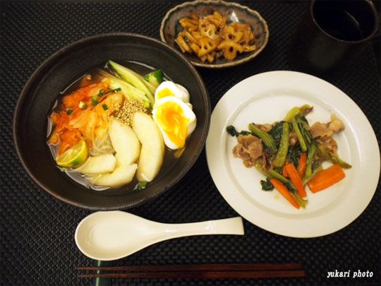 盛岡冷麺、☆豚と青梗菜の中華炒め、☆蓮根のきんぴら