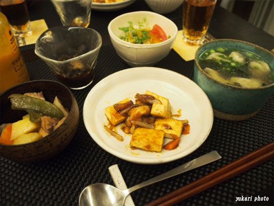 塩豆腐の黒酢炒め(OISIX)、筑前煮、生もずくつけ麺(OISIX)、サラダ(レタス、ブロッコリースーパースプラウト、トマト、青じそ)、☆水餃子(人参、えりんぎ、わかめ、白ごま、青ねぎ)