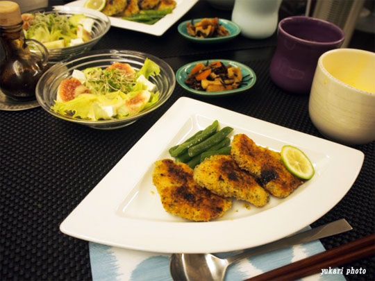 チキンカツレツ(バルサミコ酢がけ)、いんげんのソテー、☆ひじき煮(蓮根、人参、油揚げ、ちくわ)、☆サラダ(レタス、ブロッコリースーパースプラウト、いちじく、クリームチーズ)、コーンスープ(キヌア入り)