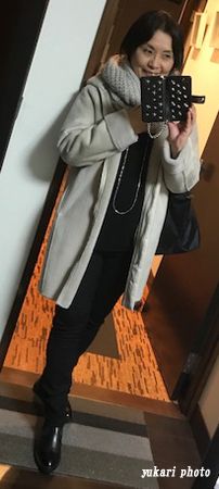 アウターはオフホワイトのフェイクムートン、それにスヌードを巻いて、ロングネックレスをして、お出かけする予定です。