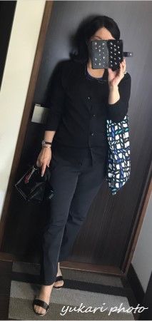 青のバッグに襟元だけリンクさせて、「 PAUL SMITH」のノースリーブセーターを選びました。