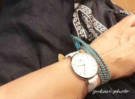 ダニエル・ウェリントンの白い時計とアメリカン・ラグ・シーで買ったターコイズカラーのブレスレットで。