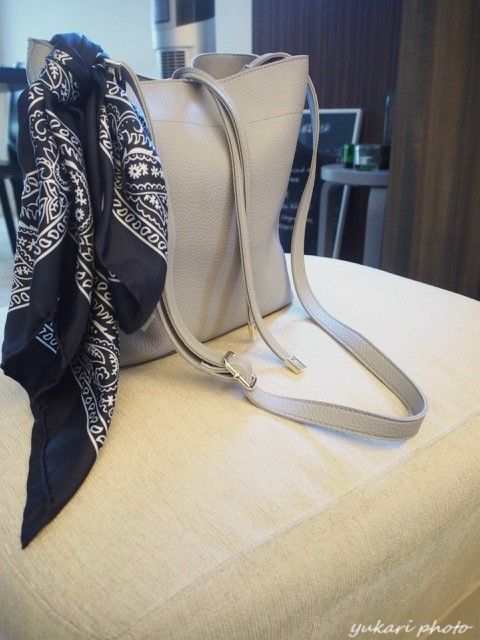 「INTERSTAPLE」のバッグはシンプルなバッグなので、「MANIPURI」のスカーフを巻きました。