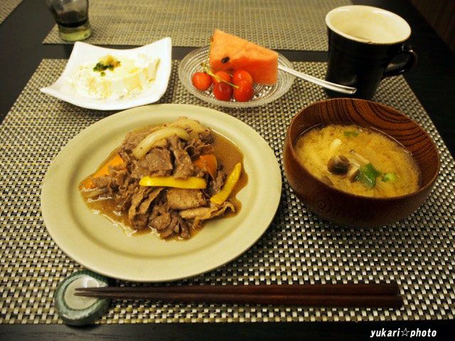焼き肉(牛肉、玉ねぎ、人参、カラーピーマン)、湯葉豆腐、味噌汁(玉ねぎ、しめじ)、すいか&さくらんぼ