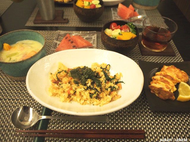 ☆鮭チャーハン(鮭の西京漬け、青じそ、玉子、海苔)、ささみのピカタ、サラダ(フリルレタス、きゅうり、かぼちゃ、トマト、カラフルピーマン、えごま油)、☆ホワイトシチュー(ベーコン、玉ねぎ、人参、しめじ、かぼちゃ、小松菜)、すいか