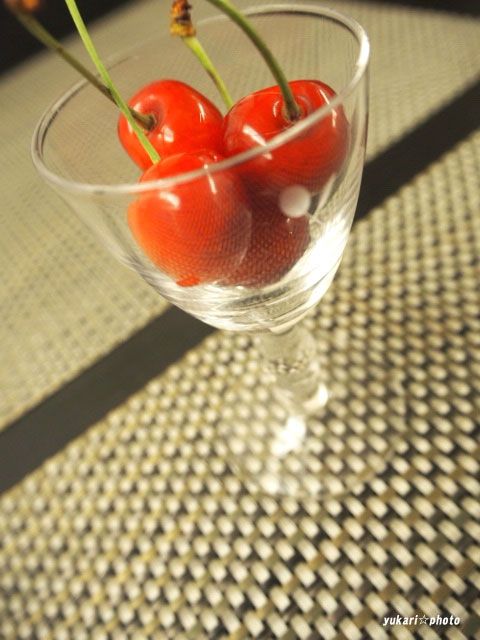 IKEAのさくらんぼ?が描かれた小さなグラスにちょこっと入れて。
