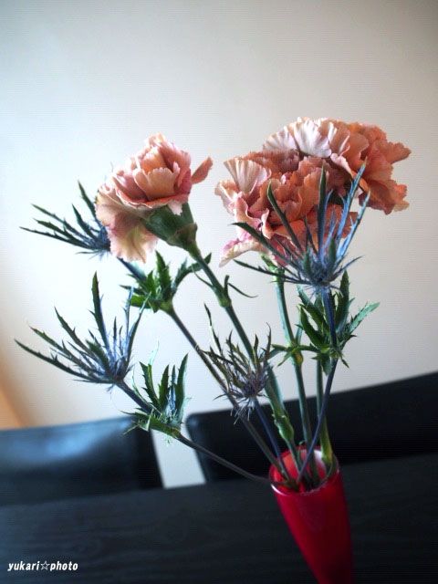 お花はアンティークなピンク色に青い色をさし色にして玄関に飾りました。