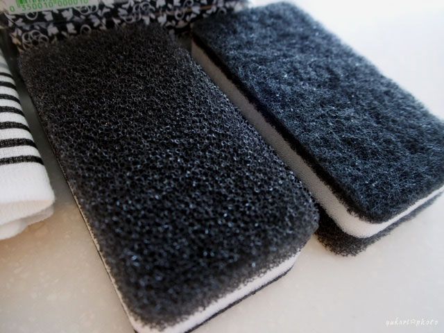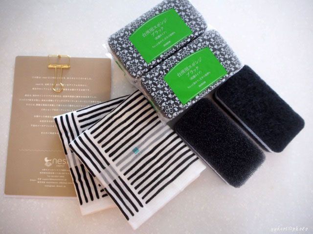 ダスキンさんのブラックなキッチンスポンジ6個と、​ 北欧モダンなインテリア雑貨 nest ​さんオリジナルのモノトーンのかや生地ふきんです。