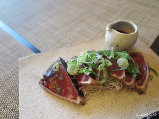 カツオのたたきはイムサエムさんのフラット皿に盛って。