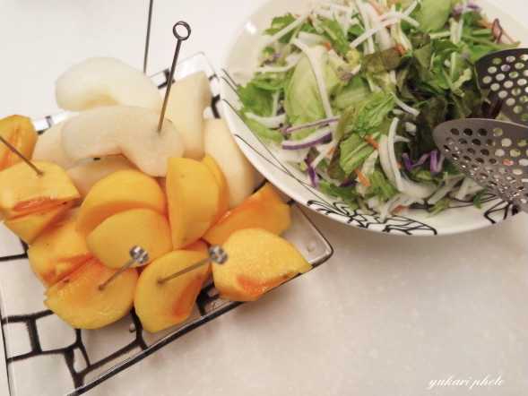 近所に住む叔母が、サラダを作ってきてくれて、柿と梨を切ってきてくれました。