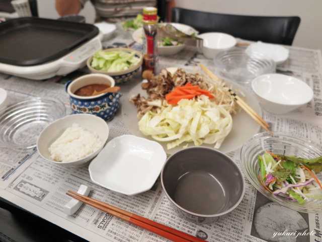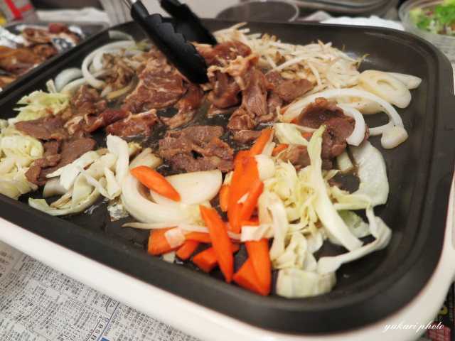 ホットプレートでまずは野菜を周りに敷き詰めてから、真ん中にお肉を入れて焼きました。