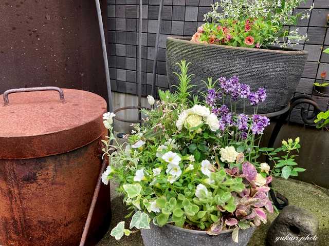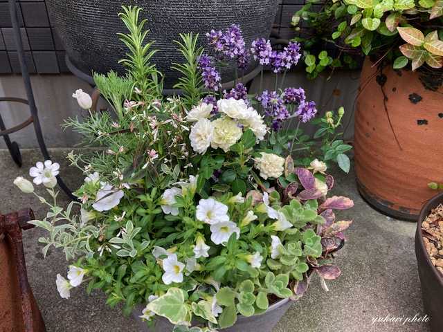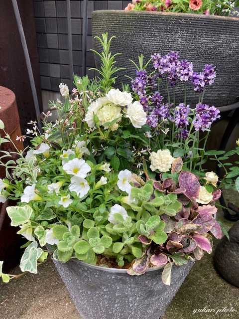 鉢付きの寄せ植えはハーブと季節の寄せ植えです。