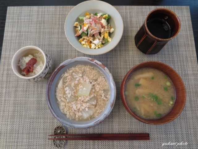 ☆鶏ひき肉と冬瓜の煮物、サラダ(ブロッコリー、かにかま、ゆで玉子)、味噌汁(エリンギ、油揚げ、青ねぎ)、梅干しごはん