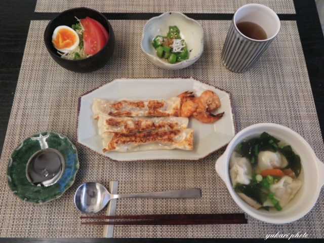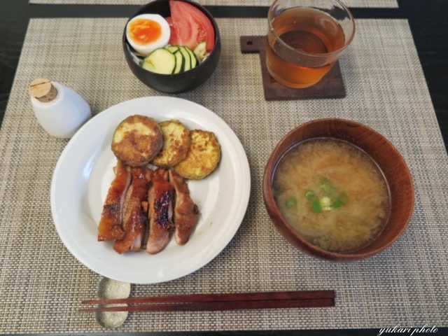 鶏もも肉の醤油煮、☆ズッキーニのピカタ、サラダ(きゃべつ、ズッキーニ、トマト、ゆで玉子、味噌汁(玉ねぎ、青ねぎ)