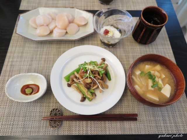 ☆豆腐ハンバーグ(おくら、しめじ、かいわれ菜のっけ)、ホタテ刺身、もずく酢(とろろ、梅干し、針生姜)、味噌汁(大根、豆腐、油揚げ、青ねぎ)