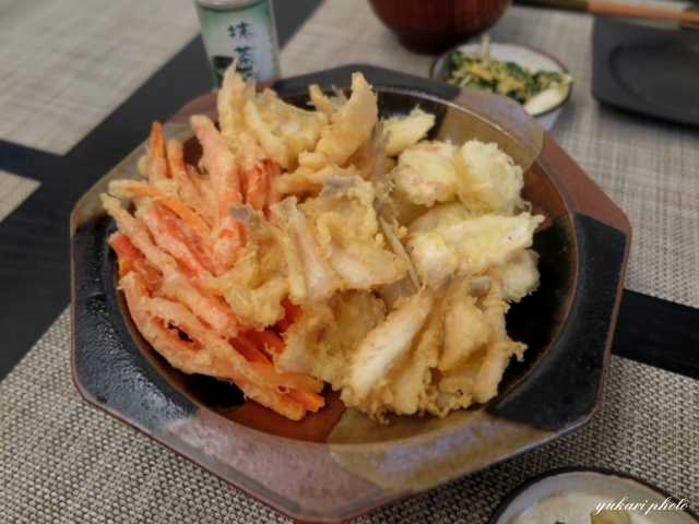 ☆天ぷら(キス、長芋、人参のかき揚げ)、☆ほうれん草とエリンギのソテー、味噌汁(玉ねぎ、青ねぎ)