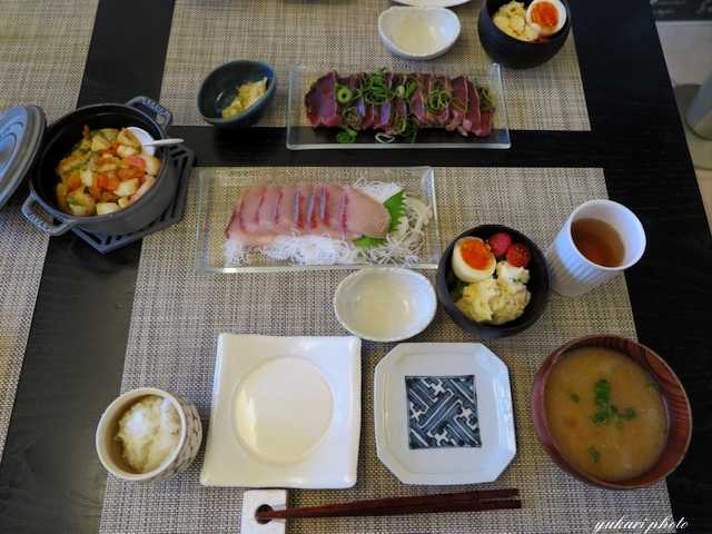 かつおのたたき、ぶりの刺身、魚介のにんにくオリーブオイル炒め(いか、海老、ホタテ、玉ねぎ、カラーピーマン)、ポテトサラダ&トマト、味噌汁(大根、なめこ、青ねぎ)