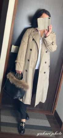 今の時期、着るのにちょうどいいトレンチコートを着て。
