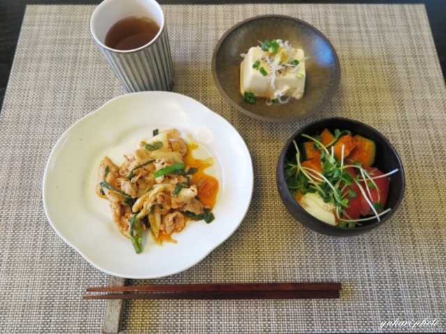 ☆豚バラ肉と小松菜のおろしポン酢、冷奴(しらす、おろし生姜、青ねぎ)、サラダ(レタス、かぼちゃ、トマト、かいわれ菜)