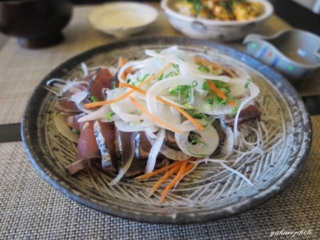 かつおのたたきは八田亨さんの三島手のうつわに盛って。