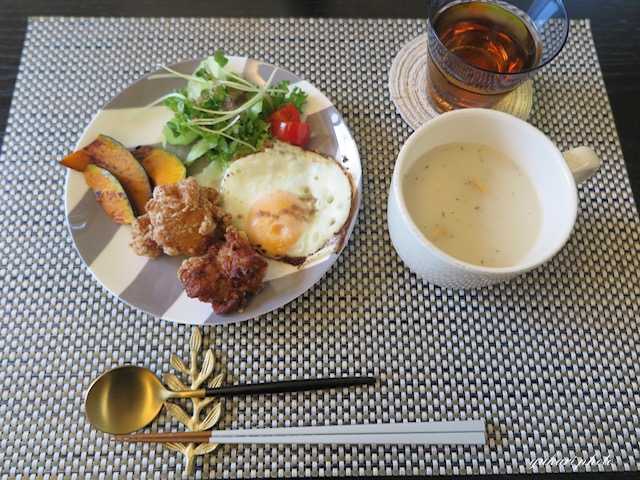 鶏のから揚げ(惣菜)、目玉焼き、かぼちゃのソテー、フリルレタス&トマト&かいわれ菜、クラムチャウダー