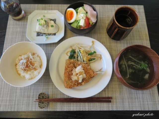 鰺フライ(おろしポン酢)、☆にらともやしの玉子炒め、男前豆腐(しらす、おろし生姜、青ねぎ)、サラダ(レタス、トマト、ハム、クリームチーズ、ゆで玉子)、味噌汁(もやし、わかめ)、おかゆ(しらす)