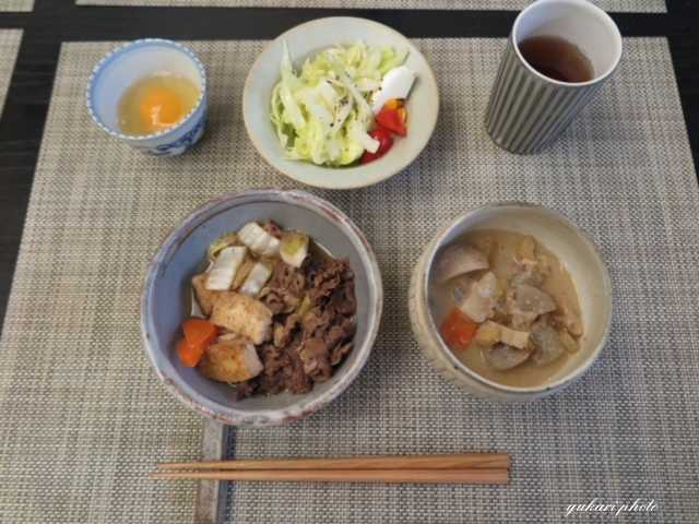 ☆牛肉のすき焼き風(牛肉、厚揚げ、白菜、長ねぎ、人参、生卵)、かす汁、サラダ(レタス、トマト、ゆで玉子)