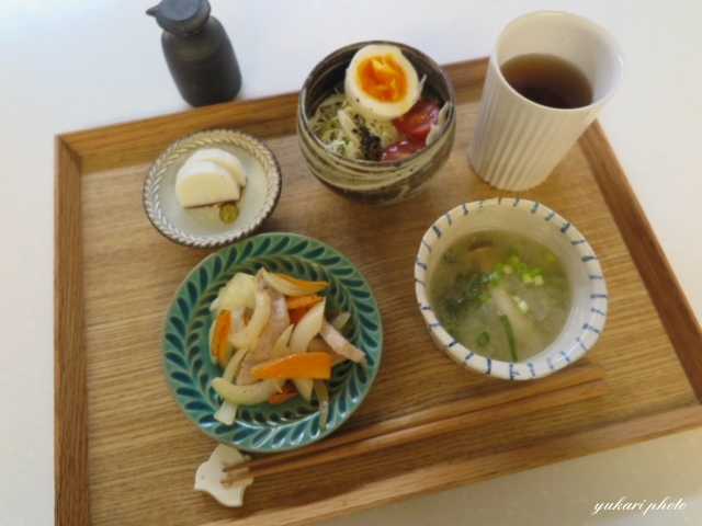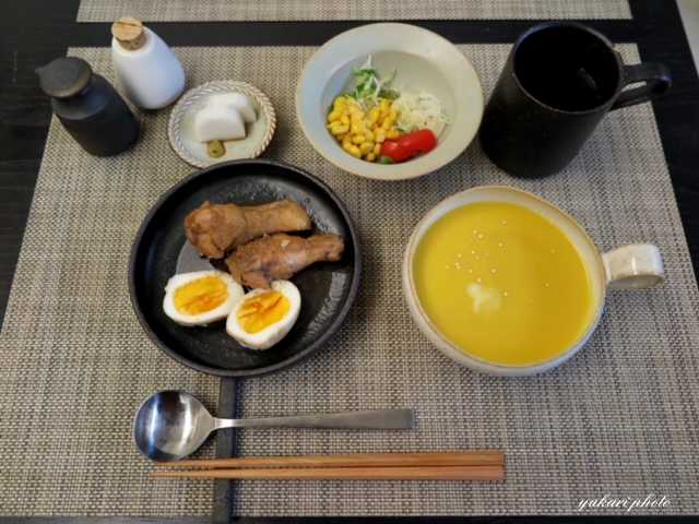 鶏手羽元とゆで玉子の醤油煮、刺身蒲鉾、サラダ(キャベツ、大葉、スイートコーン、トマト)、かぼちゃのスープ(キヌア入り)