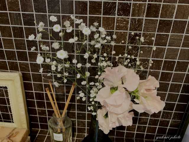 おトイレにはスイートピーともともと飾っていたかすみ草を合わせて。