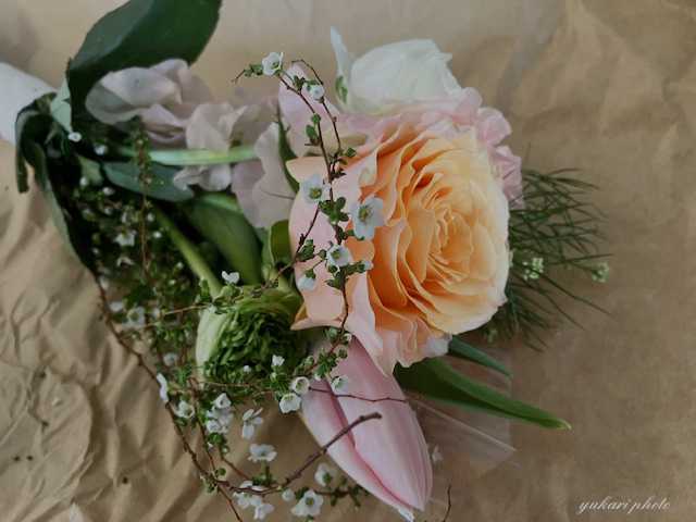 セット内容は、ラナンキュラス、ばら、ガーベラ、チューリップ、雪柳、スイートピー、ニゲラ、ユーカリです。