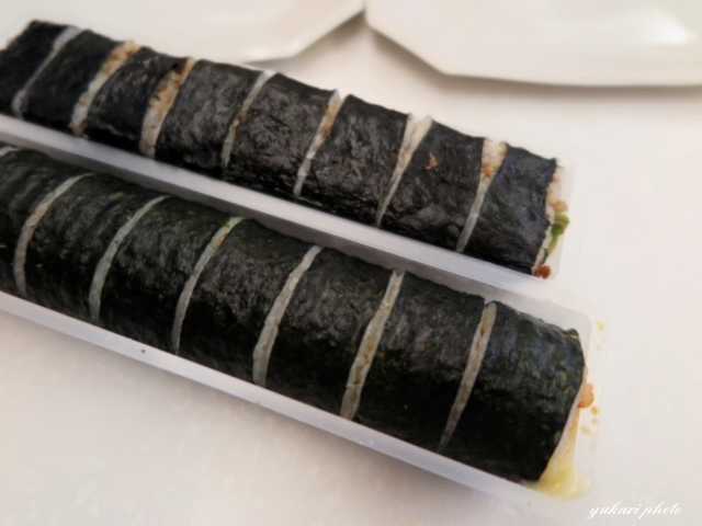 キンパは2種類あって、上はコチジャンが効いた蒸し鶏とチーズが入ったもの、下は甘辛く味付けした牛肉と玉子などが入ったキンパです。
