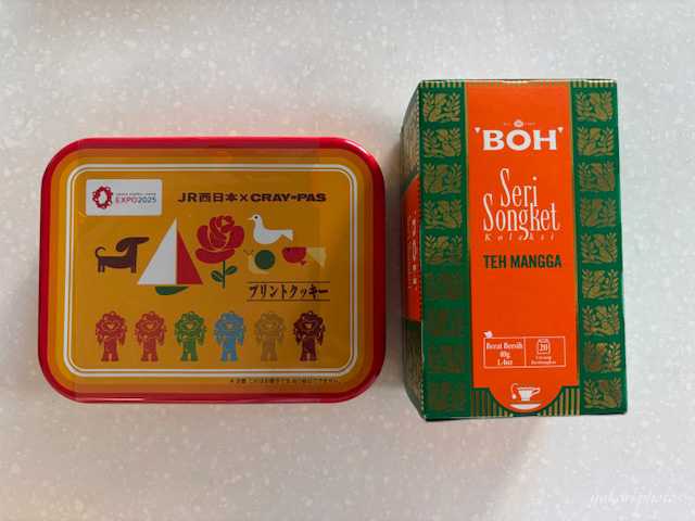 孫に買ったミャクミャクのクッキーとマレーシア館で買った紅茶です。