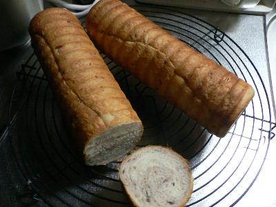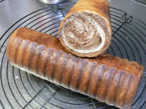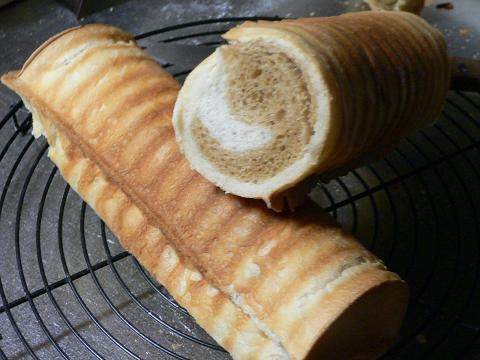今日はマーブルな感じで。チョコシートを練りこんでみました。シート6/1です。いつもは折込にするんですがそうなると空洞になる事があったのでもう少し練りこんだほうがいいのかと。この型ではシートは練りこんだほうが失敗しにくい気がします。細かくしてミックスコールでいれたら混ざらなかったのでもう一度まわしてみたり(笑)前の失敗を考慮して●型にショートニングをぬる●粉を200gにして全体を減らす●焼き時間を3分追加生地量なかなかいい感じです。焼き色はチョコを入れたので少し濃いですがこのくらいの時間がいいようです。味はもう少し砂糖と油脂を多くしてもいいかなあ~と。一本はラッピングしてお友達にあげます