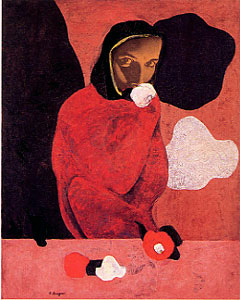 世田谷美術館 山口薫展具象と抽象の油絵画家色彩がレンガ色、濃い青とか深い色が使われていました潮騒?とかの題では100号近い大きなキャンバスに大きな蛸壺、回りに波これは随分と時間をかけた作品だそうですまた誕生した子牛を母牛が舐めるあげている絵は、やさしい母牛の様子がよく感じ取れ感銘を受けました花の像は女性の絵で目の色が薄いグレーなのにジーっとみつめられている印象深い作品でした 紐 紐を組んだ絵で芸術選賞を受けた絵で花の像と同じく赤の色が、朱赤、といったらよいかレンガをもっと赤くしたような色でいい色でした 絶筆となったおぼろ月と輪舞する子供たち 中学生時代の絵日記からフランス留学時代、帰国してから世田谷のアトリエ時代まで全作品の展示で、私などには理解しがたい物も多くありましたが、リアルの物から抽象までとても見応えのある展覧会でした世田谷美術館までは久しぶりに田園調布から千歳船橋行きのバスにのり砧まで、スーパー田園、中華の豪華飯店、浄水場、オーボンビュータンの尾山台、双葉学園、等々力不動、第3京浜、瀬田そして砧公園、さらに環八から一本はいると世田谷の農家さんの畑、思い出をたどって20分バスの旅でした