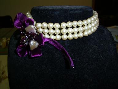 友人に頂いたパールです3連チョーカーにしてみました紫のリボンとガーネットでアクセントをつけて、結びも紫のりぼんです