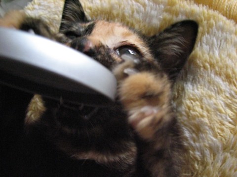 熱は 38.8 度。体重は 1.1 キロ。保護時より 220グラム 増えてますぅ~(^-^)
