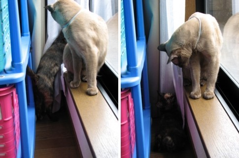 猫パンチを食らって窓枠から落とされてしまいました~(´▽`)