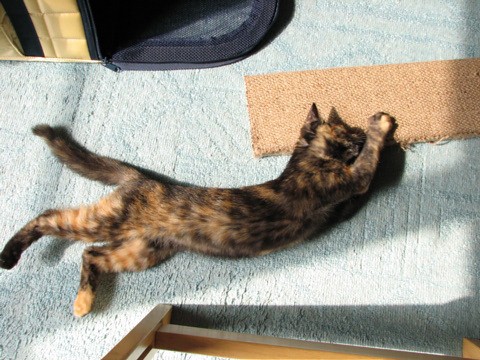 それならそれでいいもん~ とばかりに、爪とぎに爪を引っ掛けて ビヨーン と伸び~。
