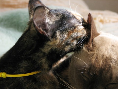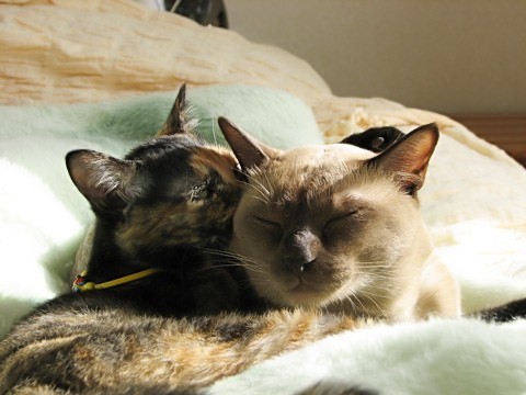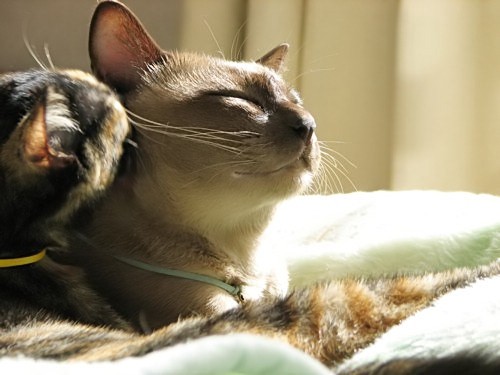 ぽかぽか暖かかったベッドの上。猫さんたちは気持ち良さそうに毛づくろい。